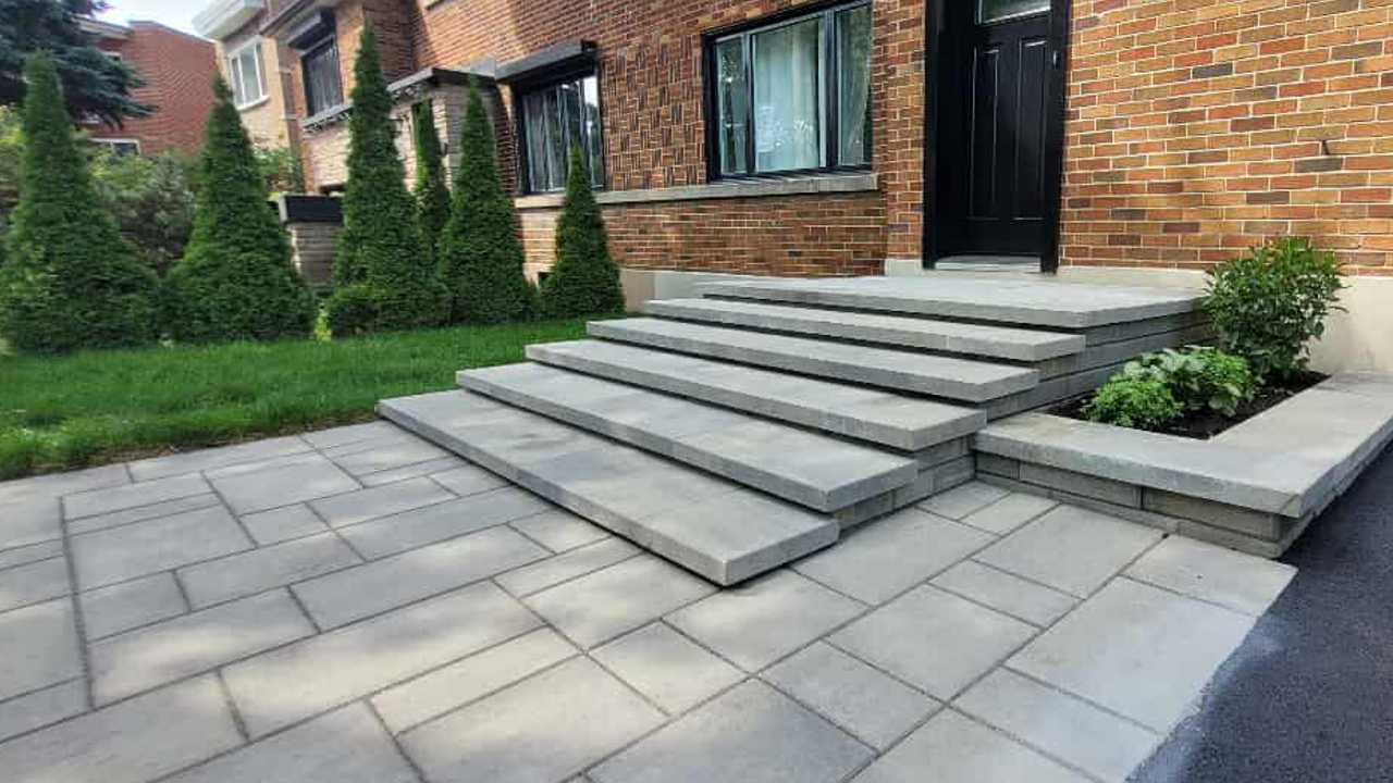 Des marches solides, antidérapantes et bien intégrées au paysage — conçues pour résister aux conditions hivernales et rester sécuritaires en toutes saisons.